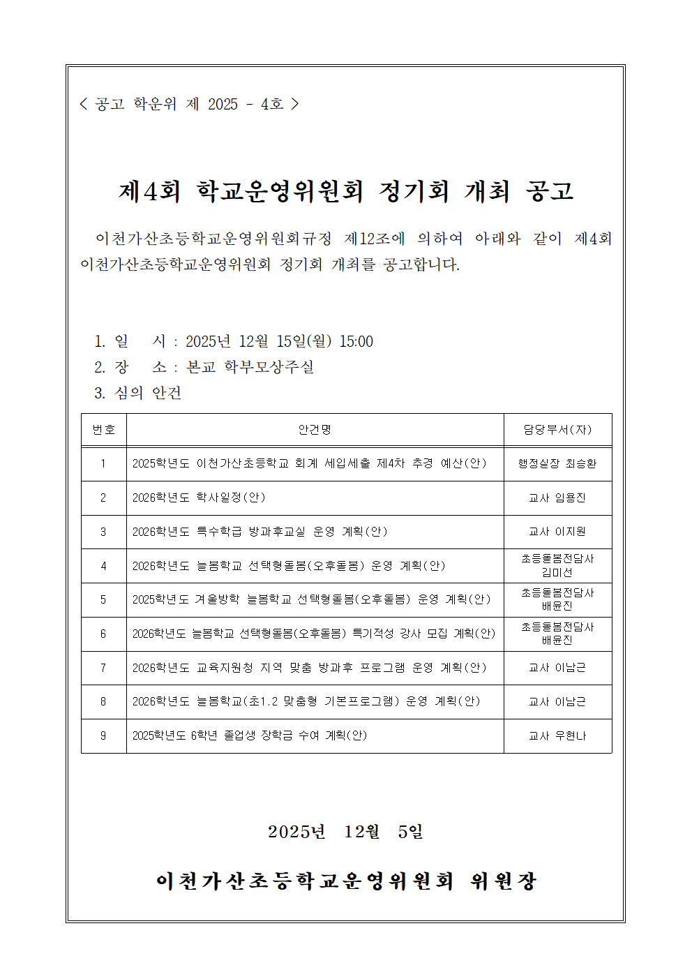 2025학년도 제4회 학교운영위원회 정기회 개최 공고